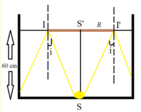 Một ngọn đèn nhỏ S đặt ở đáy một bể nước (n = 4/3), độ cao mực nước h = 60 (cm). Bán