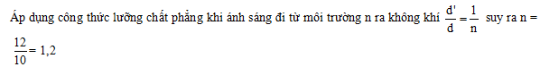 Một điểm sáng S nằm trong chất lỏng (chiết suất n), cách mặt chất lỏng một khoảng 12 (cm), phát ra chùm sáng hẹp đến gặp mặt phân cách tại điểm I với góc tới rất nhỏ, tia ló truyền theo phương IR. Đặt mắt trên phương IR nhìn thấy ảnh ảo S’ của S dường như cách mặt chất lỏng một khoảng 10 (cm). Chiết suất của chất lỏng đó là