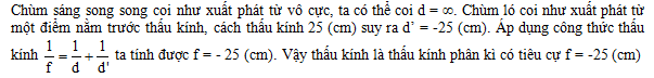 Chiếu một chùm sáng song song tới thấu kính thấy chùm ló là chùm phân kì coi như xuất phát từ một điểm nằm trước thấu kính và cách thấu kính một đoạn 25 (cm). Thấu kính đó là: