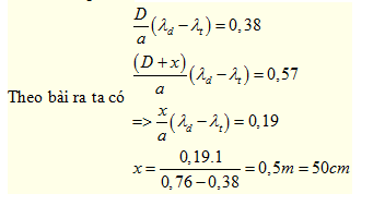 Trong thí nghiêm Y - âng về giao thoa ánh sáng với nguồn ánh sáng trắng có bước sóng trong khoảng 0,38 μm ≤ λ ≤ 0,76 μm, hai khe hẹp cách nhau 1 mm. Bề rộng quang phổ bậc 1 lúc đầu đo được 0,38 mm. Khi dịch màn ra xa hai khe thêm một đoạn thì bề rộng quang phổ bậc 1 trên màn đo được là 0,57 mm. Màn đã dịch chuyển một đoạn thẳng