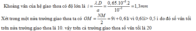 Trong thí nghiệm Y- âng về giao thoa ánh sáng đơn sắc. Khoảng cách giữa hai khe a = l mm, bước sóng ánh sáng λ = 0,65 μm và khoảng cách từ mặt phẳng chứa hai khe hẹp đến màn quan sát là 2 m. Trên trường giao thoa đối xứng qua O có bề rộng 2,5 cm quan sát được số vân tối là