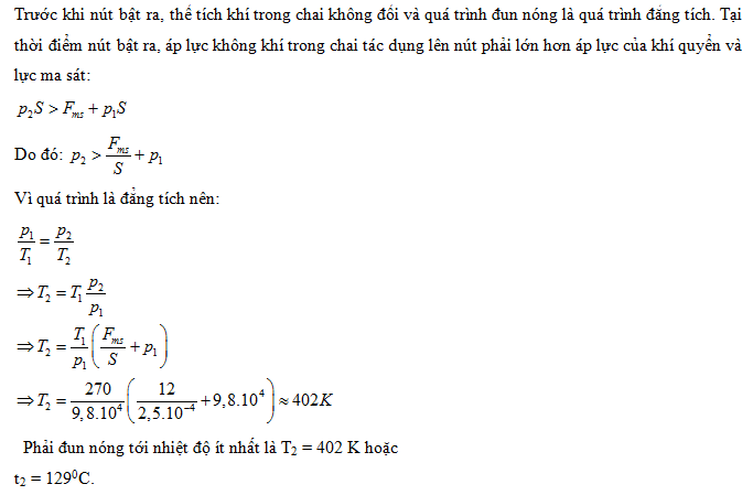 Một chai chứa không khí được nút kín bằng một nút có trọng lượng không đáng kể, tiết diện 2,5cm2. Hỏi phải đun nóng không khí trong chai lên tới nhiệt độ tối thiêu bằng bao nhiêu để nút bật ra ? Biết lực ma sát giữa nút và chai có độ lớn là 12 N, áp suất ban đầu của không khí trong chai bằng áp suất khí quyển và bằng 9,8.104Pa, nhiệt độ ban đầu của không khí trong chai là -30C.