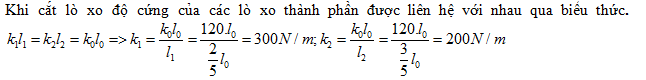Một lò xo đồng chất tiết diện đều có độ cứng k=120N/m, được cắt thành hai đoạn có chiều dài theo tỷ lệ 2:3 . Độ cứng của hai đoạn lò xo là