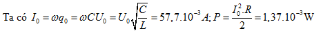 Một mạch dao động gồm cuộn cảm có độ tự cảm 27μH , trở thuần 1 và một tụ điện có điện dung 3000pF. Hiệu điện thế cực đại giữa hai bản tụ điện là 5V. Để duy trì dao động cần cung cấp cho mạch điện một công suất là