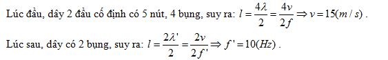 Trên sợi dây OA dài 1,5m, đầu A cố dịnh và đầu O dao động điều hòa với tần số 20Hz thì trên dây có 5 nút, O là nút. Muốn trên dây rung thành 2 bụng sóng thì O phải dao động với tần số :