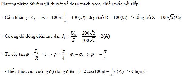 Đặt điện áp u = 200cos100πt (V) vào hai đầu đoạn mạch mắc nối tiếp gồm điện trở thuần 100Ω và cuộn cảm thuần có độ tự cảm 1/ π . Biểu thức cường độ dòng điện trong đoạn mạch là