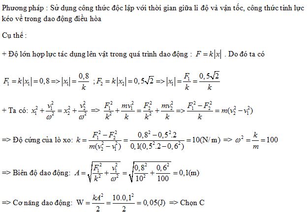 Một vật có khối lượng 100 g dao động điều hòa, khi hợp lực tác dụng lên vật có độ lớn 0,8 N thì vật đạt tốc độ 0,6 m/s. Khi hợp lực tác dụng lên vật có độ lớn \(0,5\sqrt 2 \,\,N\) thì tốc độ của vật là \(0,5\sqrt 2 \,\,m/s\). Cơ năng của vật là
