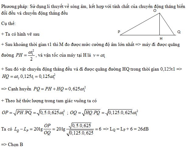 Tại vị trí O trong trên mặt đất có một nguồn âm điểm phát âm đẳng hướng ra không gian với công suất không đổi. Hai điểm P và Q lần lượt trên mặt đất sao cho OP vuông góc với OQ. Một thiết bị xác định mức cường độ âm M bắt đầu chuyển động thẳng với gia tốc a không đổi từ P hướng đến Q, sau khoảng thời gian t1 thì M đo được mức cường độ âm lớn nhất; tiếp đó M chuyển động thẳng đều và sau khoảng thời gian 0,125t1 thì đến điểm Q. Mức cường độ âm đo được tại P là 20 dB. Mức cường độ âm tại Q mà máy đo được là