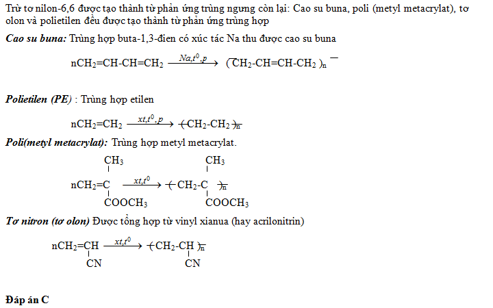Cho các chất: Cao su buna, poli (metyl metacrylat), tơ olon, tơ nilon-6,6 và polietilen. Số chất được tạo thành từ phản ứng trùng hợp là