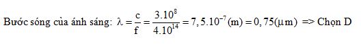 Một ánh sáng đơn sắc có tần số 4.1014 Hz truyền trong chân không với tốc độ 3.108 m/s. Bước sóng của ánh sáng này trong chân không là
