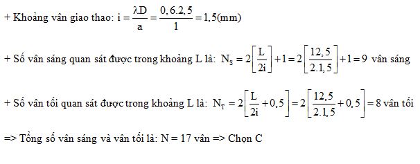 Trong thí nghiệm Y-âng về giao thoa ánh sáng, hai khe được chiếu bằng ánh sáng đơn sắc có bước sóng 0,6 µm. Khoảng cách giữa hai khe là 1 mm, khoảng cách từ mặt phẳng chứa hai khe đến màn quan sát là 2,5 m. Trên màn, xét vùng giao thoa có bề rộng 1,25 cm đối xứng qua vân sáng trung tâm, có tổng số vân sáng và vân tối là