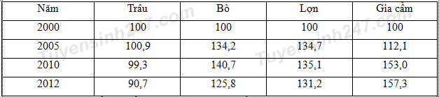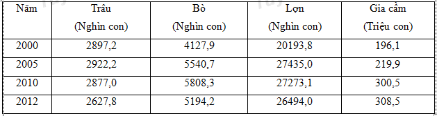 Cho bảng số liệu: số lượng gia súc, gia cầm của nước ta giai đoạn 2000 – 2012 Nhận xét