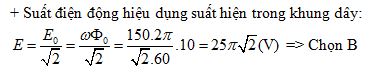 Một khung dây dẫn quay đều quanh trục trong một từ trường đều có cảm ứng từ vuông góc với trục quay của khung với tốc độ góc = 150 vòng/phút. Từ thông cực đại qua khung dây là 10 Wb. Suất điện động hiệu dụng trong khung dây bằng
