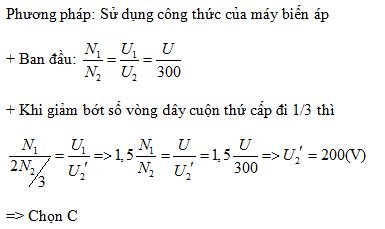 Đặt vào hai đầu cuộn sơ cấp của máy biến áp lí tưởng một điện áp xoay chiều có giá trị hiệu dụng không đổi thì điện áp hiệu dụng hai đầu cuộn thứ cấp để hở là 300 V. Nếu giảm bớt một phần ba tổng số vòng dây của cuộn thứ cấp thì điện áp hiệu dụng hai đầu của nó là