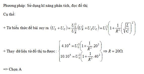 Một học sinh làm thí nghiệm để đo điện trở thuần R. Học sinh này mắc nối tiếp R với cuộn cảm thuần L và tụ điện C thành mạch điện AB, trong đó điện dung C có thể thay đổi được. Đặt vào hai đầu AB một điện áp xoay chiều u = U0cosωt (V) (với U0 và ω không đổi). Kết quả thí nghiệm được biểu diễn bằng đồ thị như hình vẽ. Biết , trong đó UR, UL và UC lần lượt là điện áp hiệu dụng trên điện trở thuần, cuộn cảm và tụ điện. Giá trị của điện trở thuần R là