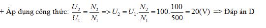 Một máy biến áp có hai cuộn dây, cuộn sơ cấp có 500 vòng, cuộn thứ cấp có 100 vòng. Đặt vào 2 đầu cuộn sơ cấp một điện áp xoay chiều có giá trị hiệu dụng 100 V thì điện áp hiệu dụng ở 2 đầu cuộn thứ cấp là