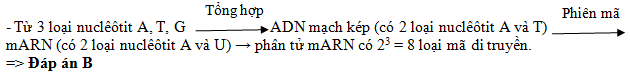 Chỉ có 3 loại nuclêôtit A, T, G người ta đã tổng hợp nên một phân tử ADN nhân tạo, sau đó sử dụng phân tử ADN này làm khuôn để tổng hợp một phân tử mARN. Phân tử mARN này có tối đa bao nhiêu loại mã di truyền?
