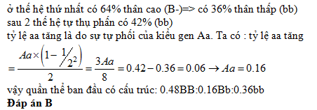 Một quần thể thực vật có tỷ lệ cây thân cao là 64%. Sau hai thế hệ tự thụ phấn, số cây thân thấp trong quần thể là 42%. Cho biết alen B quy định thân cao trội hoàn toàn so với alen b quy định thân thấp. Cấu trúc di truyền của quần thể ban đầu là