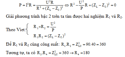Đặt điện áp xoay chiều ổn định vào hai đầu đoạn mạch có R,L,C mắc nối tiếp. Biết R là một biến trở. Điều chỉnh để R = R1 = 90Ω và R = R2 = 40Ω thì công suất tiêu thụ của đoạn mạch đều bằng P. Điều chỉnh để R = R3 = 20Ω và R = R4 thì công suất tiêu thụ của đoạn mạch bằng P’. Giá trị R4 là?