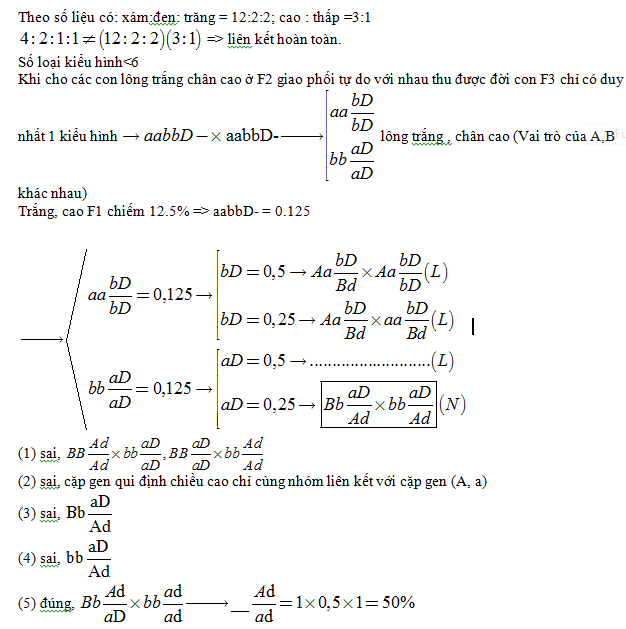 (5) Nếu cho F1 lai phân tích, đời Fb thu được kiểu hình lông xám chân thấp chiếm 50%.