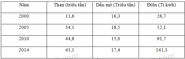 Cho bảng số liệu: Sản lượng than, dầu thô và điện của nước ta giai đoạn 2000 –