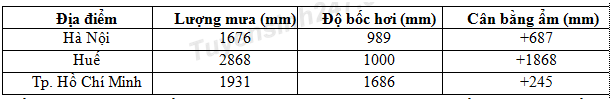 Cho bảng số liệu Lượng mưa, lượng bốc hơi và cân bằng ẩm của một số địa điểm (Đơn