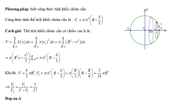 Cho khối cầu tâm O bán kính R. Mặt phẳng (P) cách O một khoảng \({R \over 2}\) chia khối cầu thành 2 phần. Tính tỉ số thể tích của hai phần đó: