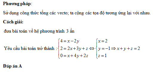 Trong hệ tọa độ \(Oxyz\), cho các vecto \(\overrightarrow a = \left( {1;2;1} \right),\overrightarrow b = \left( { - 2;3;4} \right)\),\(\overrightarrow c = \left( {0;1;2} \right),\overrightarrow d = \left( {4;2;0} \right)\). Biết \(\overrightarrow d = x\overrightarrow a + y\overrightarrow b + z\overrightarrow c \), tính tổng \(x + y + z\)