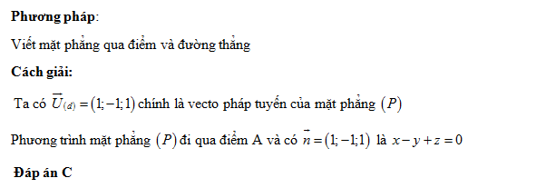Trong hệ tọa độ \(Oxyz\), cho điểm A(1;2;1) và đường thẳng \(d:{{x + 1} \over 1} = {{y - 2} \over { - 1}} = {z \over 1}\). Viết phương trình mặt phẳng chứa A và vuông góc với d?