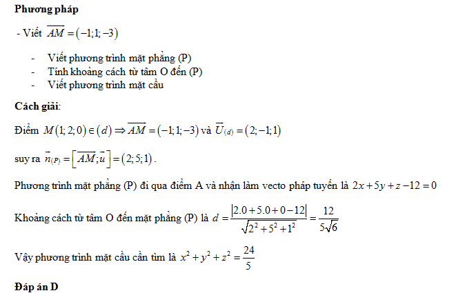 Trong hệ tọa độ \(Oxyz\), cho hai điểm \(A(2;1;3)\) và đường thẳng d có phương trình \({{x - 1} \over 2} = {{y - 2} \over { - 1}} = {z \over 1}\). Mặt phẳng (P) chứa A và D. Viết phương trình mặt cầu tâm O tiếp xúc với mặt phẳng (P)?