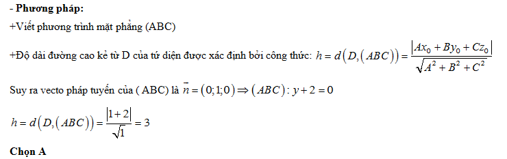 Cho bốn đỉnh A(-1;-2;4); B(-4;-2;0); C(3;-2;1); D(1;1;1). Khi đó độ dài đường cao của tứu diện