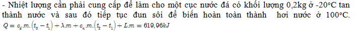 Tính nhiệt lượng cần phải cung cấp để làm cho 0,2kg nước đá ở -20oC tan thành nước và sau đó được tiếp tục đun sôi để biến hoàn toàn thành hơi nước ở 100oC. Nhiệt nóng chảy riêng của nước đá là 3,4.105J/kg, nhiệt dung riêng của nước đá là 2,09.103J/kg.K, nhiệt dung riêng của nước 4,18.103J/kg.K, nhiệt hóa hơi riêng của nước là 2,3.106J/kg.