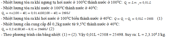 lấy 0,01kg hơi nước ở 1000C cho ngưng tụ trong bình nhiệt lượng kế chứa 0,2kg nước ở 9,50C.