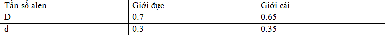 Ở mèo D lông đen ; d lông trắng ; Dd lông hung và gen này nằm ở đoạn không tương đồng của X. Một quần thể mèo có 350 đực lông đen ; 149 mèo đực lông trắng ; 250 mèo cái lông đen ; 150 mèo cái lông hung và 101 mèo cái lông trắng. Tần số tương đối của D và d trong quần thể lần lượt là