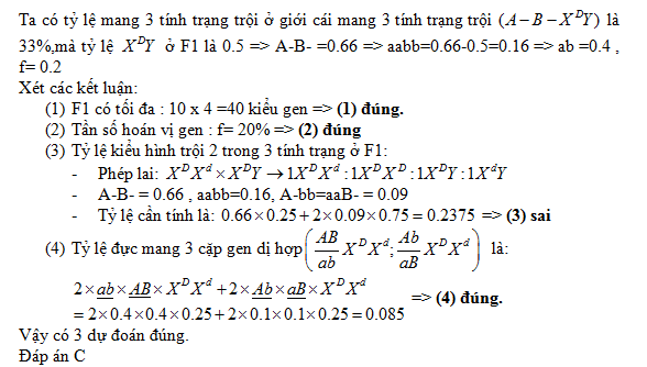 (cái) ,tạo ra F1 có kiểu hình ở giới cái mang 3 tính trạng trội chiếm tỉ lệ 33%. Trong các dự đoán sau, có bao nhiêu dự đoán đúng?