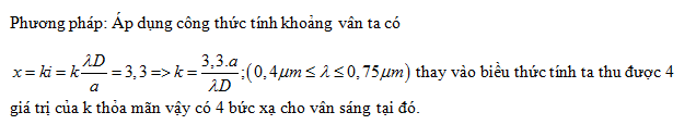 Tong thí nghiệm Iang về giao thoa ánh sáng, biết D = 2m; a = 2mm. Hai khe được chiếu bằng ánh sáng trắng ( có bước sóng từ 0,4 µm dến 0,75 µm ). Tại điểm trân màn quan sát cách vân trắng chính giữa 3,3 mm có bao nhiêu bức xạ cho vân sáng tại đó ?