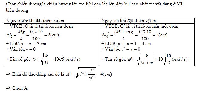 Một lò xo lý tưởng có độ cứng k=100 N/m. Một đầu gắn vào điểm I cố định, một đầu đỡ vật nặng M=200g, lấy g=10 m/s2, bỏ qua ma sát và sức cản. Kích thích cho vật dao động điều hòa với biên độ 3 cm quanh vị trí cân bằng theo phương thẳng đứng. Khi vật M lên tới điểm cao nhất thì người ta đặt them vật m=100g lên vật M. Dao động của hệ sau đó có biên độ là