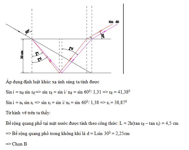 Chiếu một chùm sáng hẹp tới mặt trên của một chậu nước dưới góc tới i=600 chiết suất của nước với ánh sang đỏ và tím là nđ=1,31; nt=1,38. Độ sâu của lớp nước là 30cm, đáy chậu đặt một gương phẳng nằm ngang, bề rộng dải quang phổ liên tục thu được ở ngoài không khí: