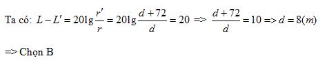 Mức cường độ âm do nguồn S gây ra tại điểm M cách S một khoảng d là L. Cho nguồn S dịch ra xa M một khoảng 72m trên cùng phương truyền âm thì mức cường độ âm giảm đi 20 dB. Khoảng cách d là