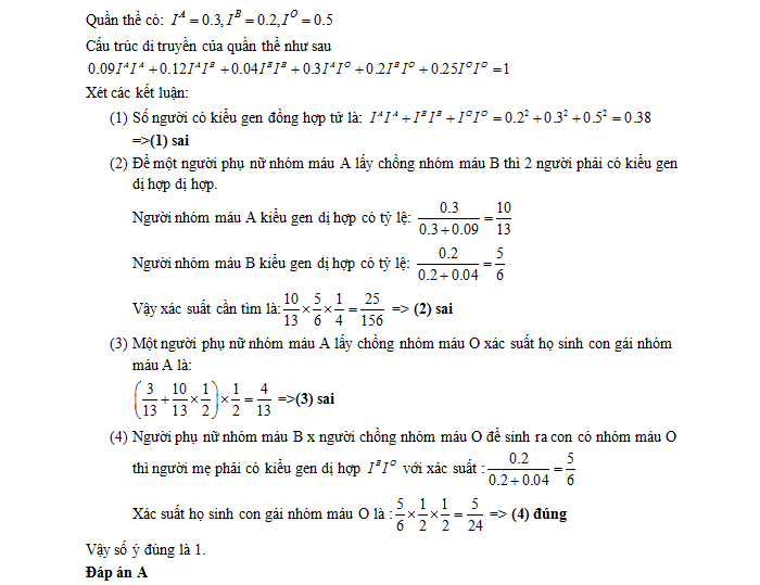 (2). Một người phụ nữ nhóm máu A lấy chồng nhóm máu B, xác suất họ sinh con nhóm máu O là 25/111.