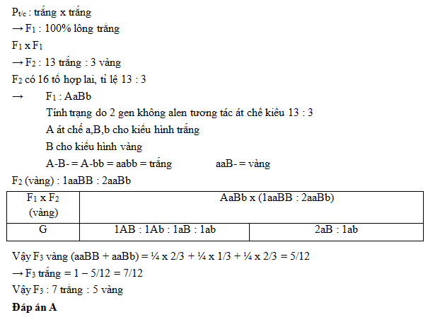 Ở một loài thú, tiến hành lai hai cá thể lông trắng thuần chủng với nhau, được F1 toàn lông trắng. Cho F1 giao phối với nhau thu được F2 gồm 81,25% lông trắng: 18,75% lông vàng. Cho F1 ngẫu phối với tất cả các cá thể lông vàng ở F2 thu được đời con. Biết không xảy ra đột biến, các gen nằm trên NST thường, theo lý thuyết tỉ lệ kiểu hình thu được ở đời sau là: