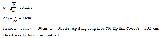 Một con lắc lò xo treo thẳng đứng gồm lò xo nhẹ có độ cứng k = 100N/m, vật có khối lượng m = 1kg. Kéo vật dọc theo trục của lò xo xuống dưới vị trí cân bằng 3cm và truyền cho nó vận tốc 30cm/s hướng lên. Chọn gốc tọa độ là vị trí cân bằng của vật, chiều dương hướng xuống, gốc thời gian là lúc vật được truyền vận tốc. Phương trình dao động của vật là
