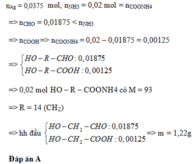 Hỗn hợp X gồm hai chất hữu cơ no, mạch hở (đều chứa C, H, O) trong phân tử mỗi chất có hai nhóm chức trong số các nhóm - OH; - CHO; - COOH. Cho m gam X phản ứng hoàn toàn với lượng dư dung dịch AgNO3 trong NH3, thu đưcọ 4,05 gam Ag và 1,86 gam một muối amoni hữu cơ. Cho toàn bộ lượng muối amoni hữu cơ này vào dung dịch NaOH (dư, đun nóng), thu được 0,02 mol NH3. Giá trị của m là: