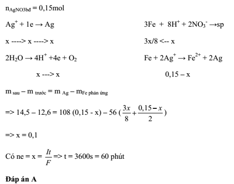 Điện phân 150ml dd AgNO3 1M với điện cực trơ trong t phút, cường độ dòng điện không đổi 2,68A (hiệu suất quá trình điện phân là 100%), thu được chất rắn X, dd Y và khí X. Cho 12,6g Fe vào Y, sau khi các phản ứng kết thúc thu được 14,5g hh kim loại và khí NO (sp khử duy nhất của N+5), Giá trị của t là: