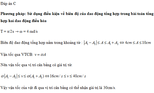 Một vật thực hiện đồng thời hai dao động điều hòa cùng phương, cùng chu kỳ T = π/2 (s), có biên độ lần lượt là 3cm và 7cm. Vận tốc của vật đi qua vị trí cân bằng có thể nhận giá trị nào dưới đây?