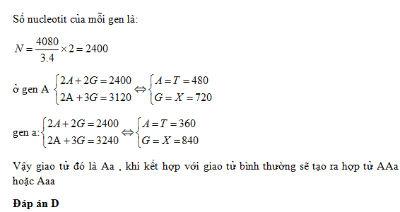 Xét một cặp gen có hai alen với chiều dài bằng nhau và bằng 4080A0 , alen A có 3120 liên kết hidro, alen a có 3240 liên kết hidro. Một loại giao tử sinh ra từ cá thể dị hợp Aa có 3120 guanin và xitorin, 1680 adenin và timin. Giao tử đó kết hợp với giao tử bình thường tạo thể lệch bội có kiểu gen là