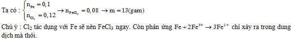 Đốt nóng 5,6 gam Fe trong bình kín chứa 0,12 mol khí Cl2. Sau khi phản ứng xảy ra hoàn toàn thu