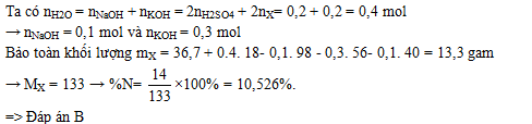 Amino axit X có công thức H2NCxHy(COOH)2. Cho 0,1 mol X vào 0,2 lít dung dịch H2SO4 0,5M, thu được dung dịch Y. Cho Y phản ứng vừa đủ với dung dịch gồm NaOH 1M và KOH 3M, thu được dung dịch chứa 36,7 gam muối. Phần trăm khối lượng của nitơ trong X là