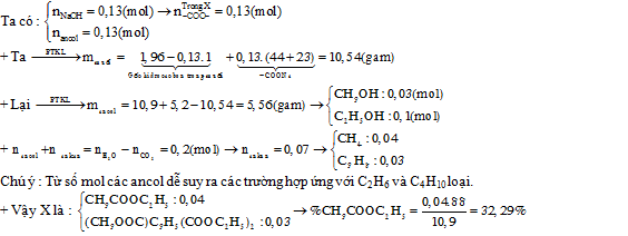 X là hỗn hợp chứa hai este đều thuần chức. Lấy 10,9 gam X tác dụng vừa đủ với dung dịch chứa 5,2 gam NaOH. Sau phản ứng thu được 0,13 mol hỗn hợp hai ancol đồng đẳng liên tiếp và hỗn hợp hai muối.Lấy toàn bộ lượng muối trên nung nóng trong hỗn hợp dư (NaOH, CaO) thu được 1,96 gam hỗn hợp hai ankan ở thể khí. Đốt cháy hoàn toàn lượng ankan và ancol trên thu được 0,36 mol CO2 và 0,56 mol H2O. Phần trăm khối lượng của este có KLPT nhỏ trong X gần nhất với :