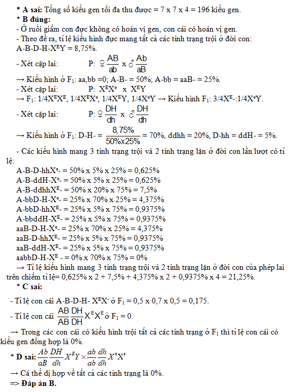 . Tỉ lệ kiểu hình đực mang tất cả các tính trạng trội ở F1 chiếm 8,75%. Cho biết không có đột biến xảy ra, hãy chọn kết luận đúng?